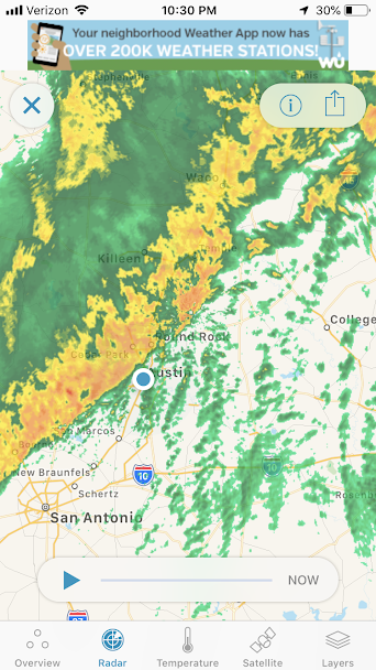 Turns out that’s where we draw the line. I figure it this way: I’m fine with some risks, life itself is dangerous. But choosing to camp in a soft-sided tent when you know a potentially tornado-bearing storm is coming just seems like asking for trouble. Especially when you can spend $150 on a hotel room and make all the worries melt away. It was kinda a no-brainer: Downtown Austin, here we come!!!